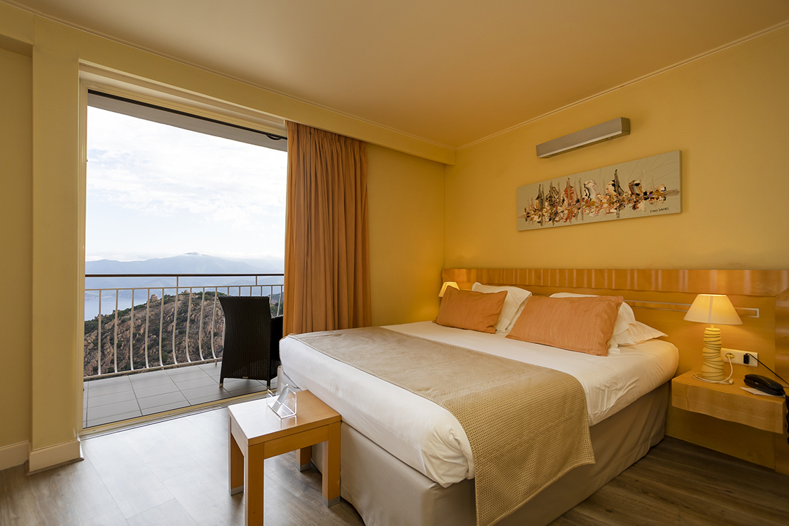 La vue dégagée qu'offrent les chambres Grand Angle sur le Golfe de Porto permet à chacun de pénétrer de plein pied dans le cadre préservé et unique des Calanches de Piana, inscrites au Patrimoine Mondial de l'UNESCO. Nul ne peut se lasser de découvrir, depuis son lit, au coucher, comme au réveil, ce panorama exceptionnel. Depuis cet espace privatif, le qualificatif d'Île de Beauté, très justement attribué à la Corse, prend tout son sens.